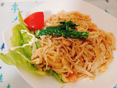 米粉の平麺、エビ、玉子、甘めの味付けが食べやすかったようです。