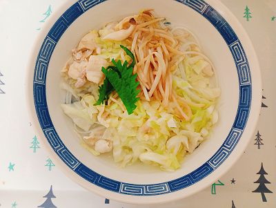 麺を30分ほどぬるま湯につけて戻し、鶏皮・茹でキャベツ、炒めたもやしなどを入れました。